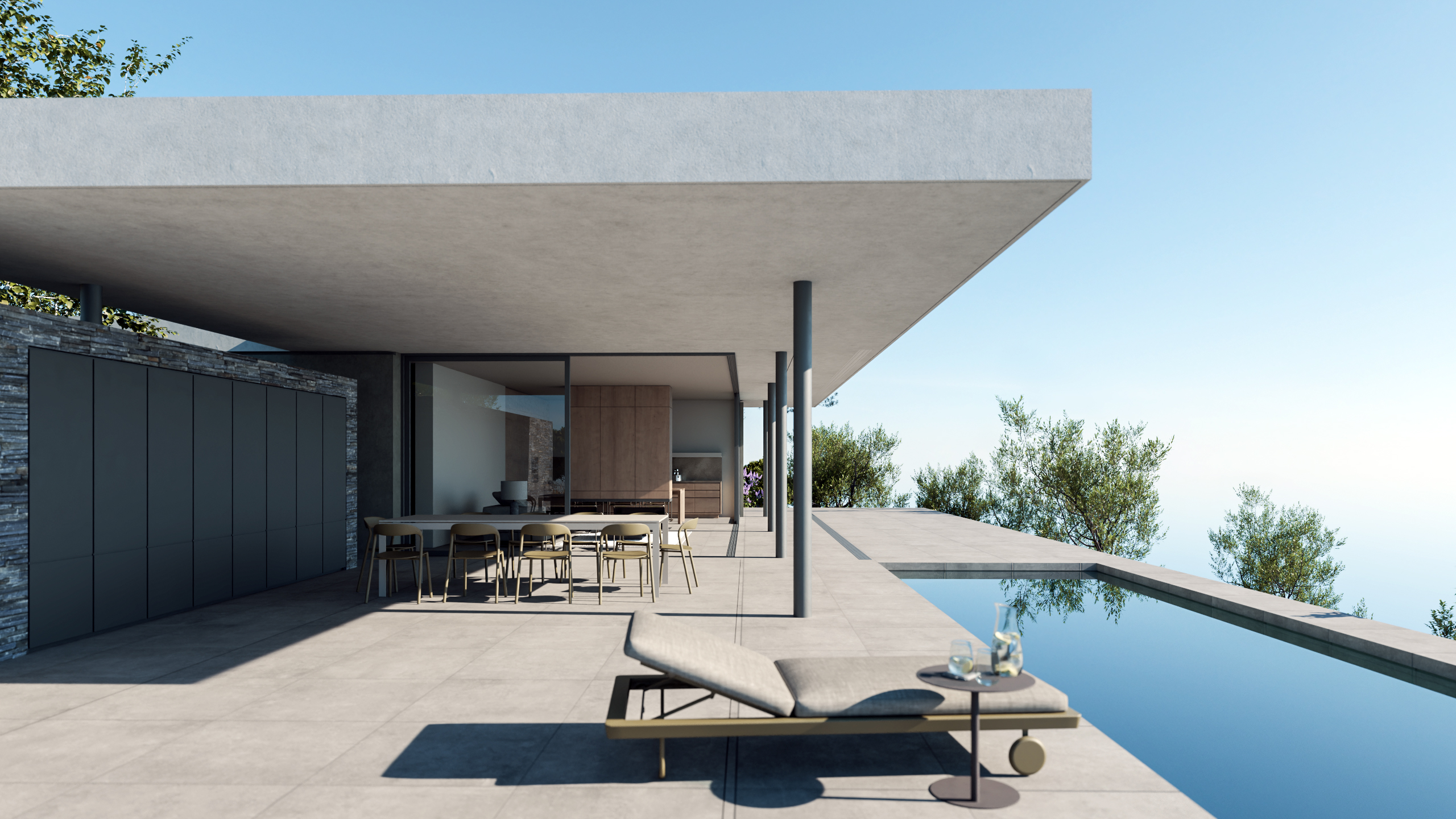 The house when opened is converted to a shaded veranda that provides areas for cooking, seating, eating, swimming, sunbathing.